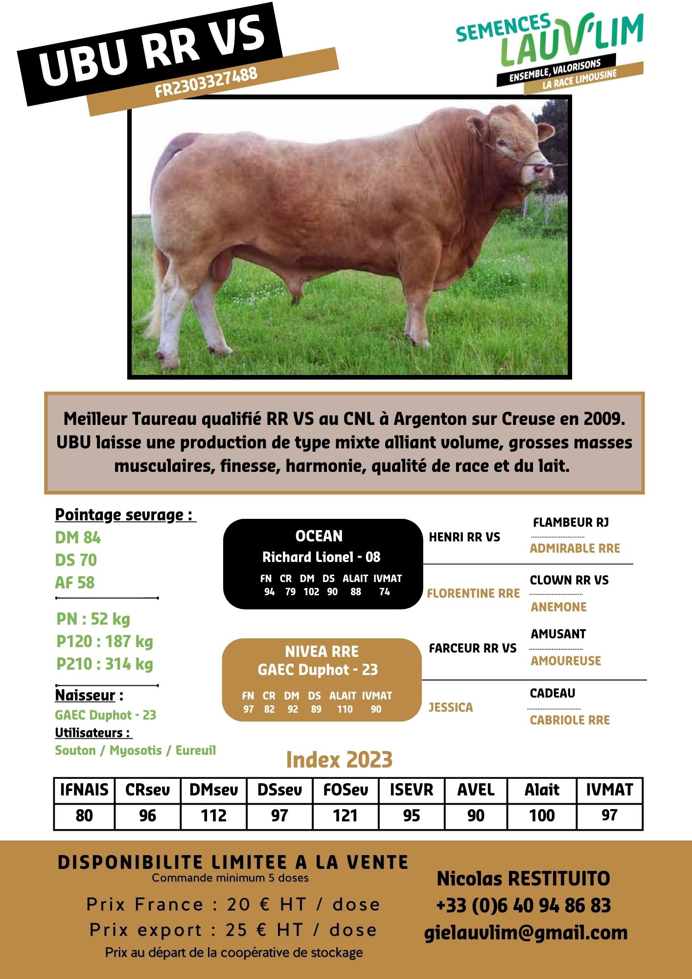 Meilleurs taureau qualifié RR VS au Concours National à Argenton sur Creuse, UBU laisse un production exceptionnelle de type mixte viande en mâle et gros mixte viande en femelles. Ses atouts sont les masses musculaires, la finesse, l'harmonie, les qualités de race et la production laitière.